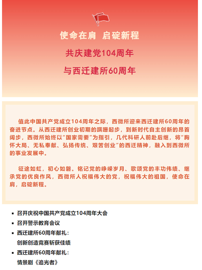 二十世紀六十年代,黨中央著眼國防和科技經濟建設布局,作出重大戰略部署,組織部分重點單位和項目西遷支援西北,孕育出了偉大的“西遷精神”,西微所正是其中一支勇擔使命的先鋒力量。