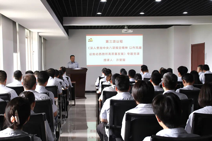 大會在莊嚴的國歌聲中拉開帷幕,激昂的旋律激發著每一位黨員的愛國熱情與使命感。黨委書記、董事長許愛國帶領預備黨員進行宣誓并作了《深入貫徹中央八項規定精神 以作風建設推動西微所高質量發展》的專題黨課。黨課指出,作風建設是黨的建設的重要組成部分,體現黨的宗旨,關系黨的形象,關系人心向背,是我們黨的優良傳統和政治優勢。西微所作為國有科研院所,正處于提質增效、推進高質量發展的關鍵階段。作風建設一旦滯后,必將掣肘生產經營效益提升與改革進程推進。為此,必須持續推進作風建設常態化長效化,著力營造奮進新征程、建功新時代的濃厚氛圍,為我所高質量發展筑牢堅實保障。